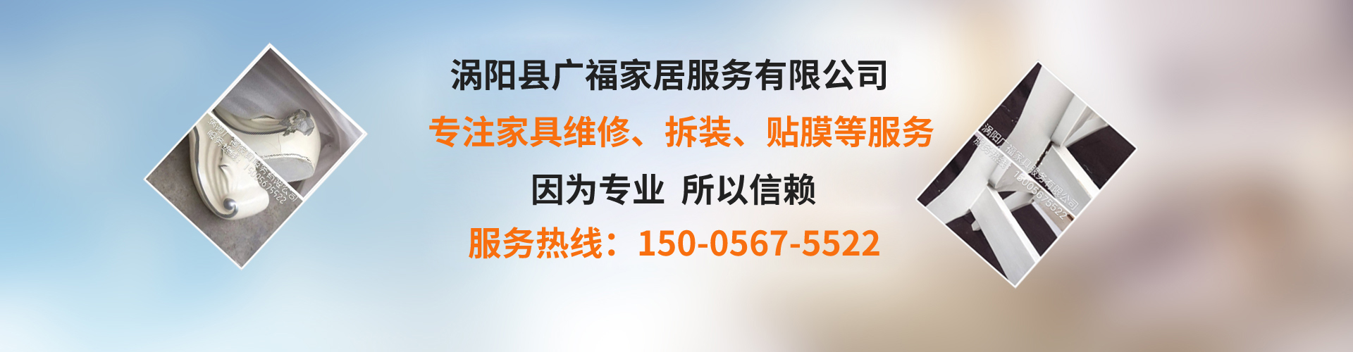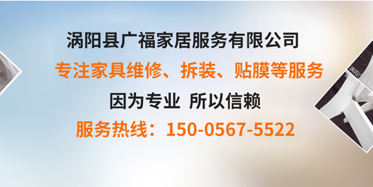 涡阳县广福家居服务有限公司,专业维修拆装、维修、配送,家具贴膜,水电安装,地砖美缝,空调,搬家一条龙服务。公司以信誉求生存,秉承一次合作终身朋友的理念,竭诚为新老客户服务,以正规的公司团队,专业高效的技术人员,优质的五金配件,低廉的收费标准,长期以来赢得了以业内外人士的一致好评!为各阶层解决了家具购买后找不到供应商售后维修难题。